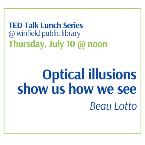 Pack a lunch, invite a friend, and join the discussion! July's selected talk is an oldie but a goodie - "Optical illusions show us how we see" by Beau Lotto. Recorded in 2009 this fun and playful talk uses color games that puzzle your vision but also spotlight what we can't see: how your brain works. Join us as we watch the talk and discuss this take on the science of sight, perception, and evolution.